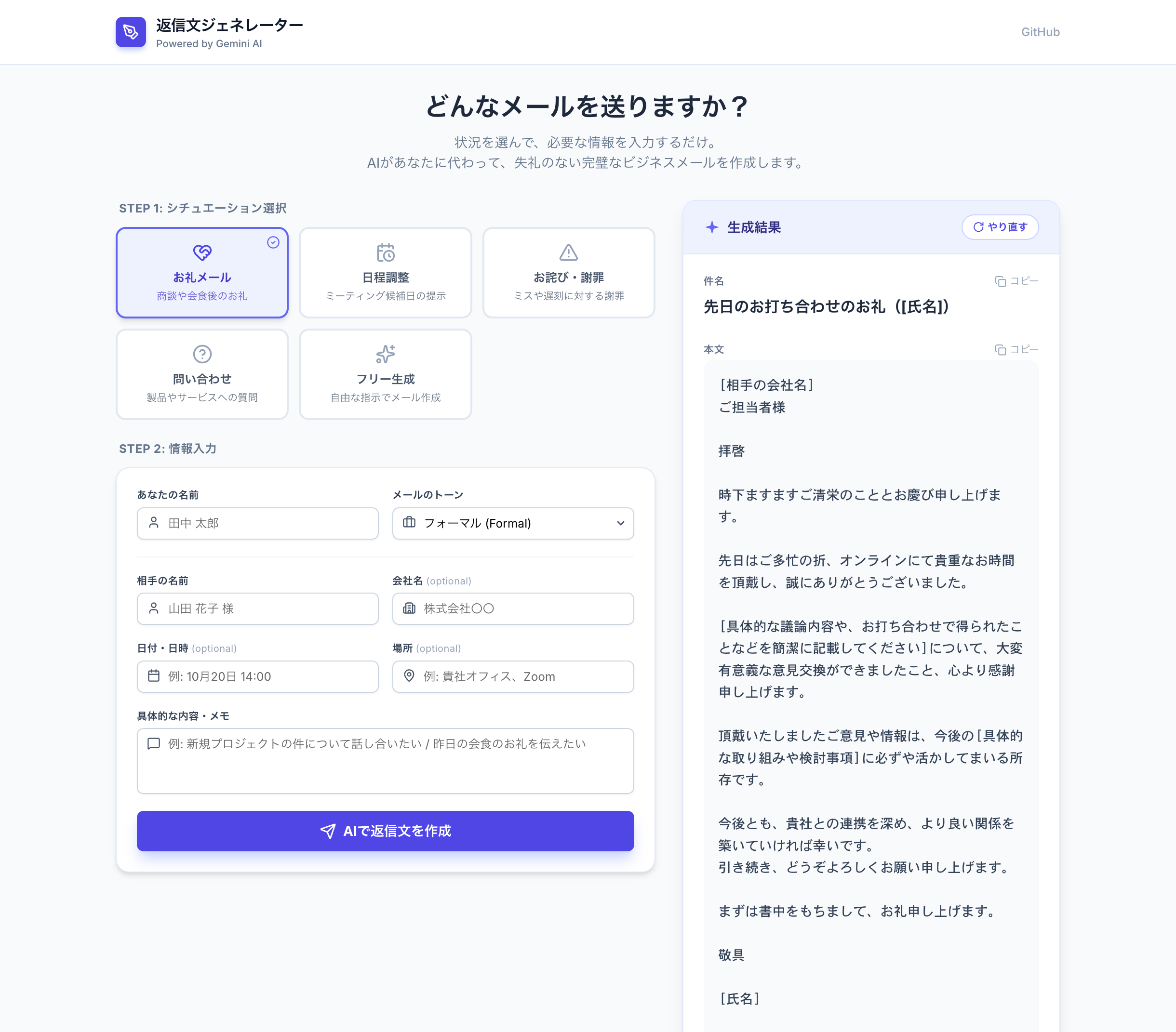- 必要な項目を埋めてから「お礼」「日程調整」などのボタンを押すと、それらの情報が反映された完璧なメッセージ文面が生成され、コピーされます。