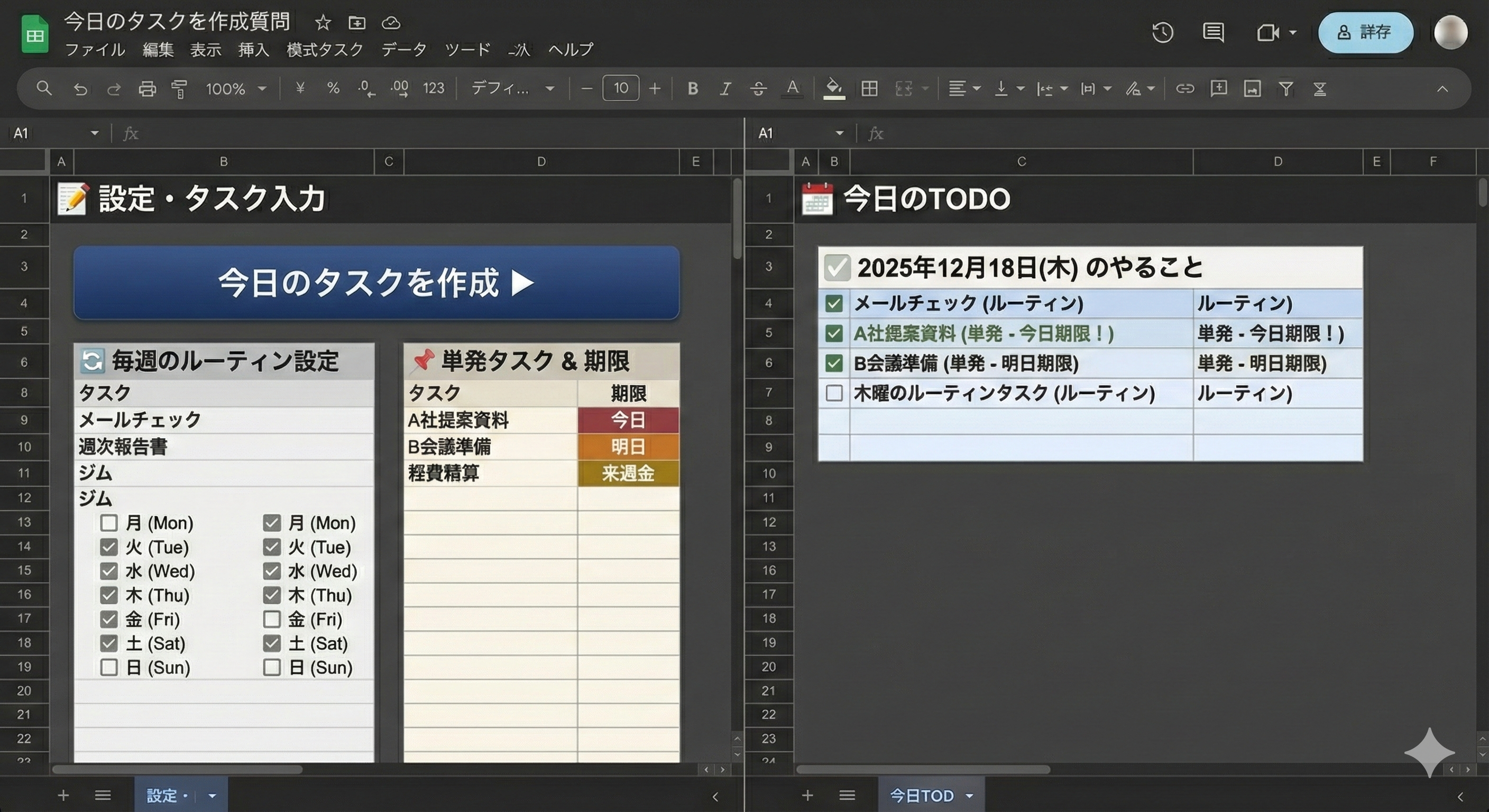 - スクリプトが「今日は月曜日だからこれ」「期限が明日までの単発タスクはこれ」と自動で判断し、今日のTODOリストを別シートにズラッと生成してくれます。